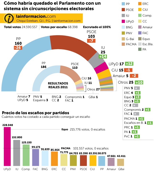 Una vez más, las elecciones generales reflejan la marcada división ideológica en España. El voto de castigo de los votantes de izquierdas ha ido a parar a cualquier opción menos al PP: IU, UPyD, otros partidos, abstenciones, votos nulos… El PP solo ha obtenido unos 400.000 votos más que en las últimas elecciones, en las que perdió. El congreso por lo tanto «está más diversificado que nunca. ¿Representará esta tendencia una profundización de la democracia?»