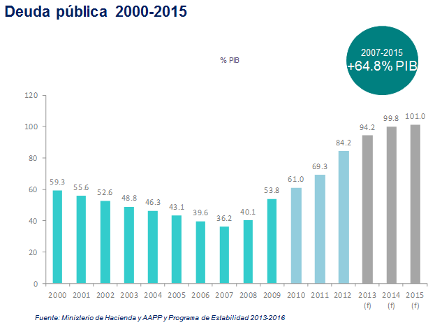 España se enfrenta a un proceso de consolidación fiscal en un contexto europeo específico, que implica que debe someter su política fiscal a los acuerdos y normas que afectan a los estados miembros y países de la zona euro. Así, se compromete a alcanzar los objetivos de déficit y deuda acordados en el seno de la UE y se sujeta a los mecanismos de alerta y sanción establecidos. A pesar de que se hable de brotes verdes, los datos no permiten ser excesivamente optimistas todavía. Se espera que los datos de cierre de 2013 sean una deuda pública igual al 94,2% del PIB, un déficit público del 6,3%, y una tasa de paro del 27,1 por ciento.